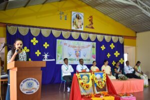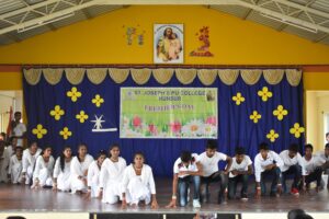 Fresher’s day and Gandhi Jayanti celebration was on 02-10-2021 at St. Joseph’s P.U. College. It began with Inter religious prayer service followed by prayer dance, welcome speech, entertainment, message and skit. The chief guest Mrs. Thriveni Asst. Professor D. Devraj College Hunsur, in her inspiring message motivated the students on the principles of Mahatma Gandhi.She encouraged the students to inculcate values of Gandhi that brighten their future by thought provoking question ‘ Do we need Gandhi today?.